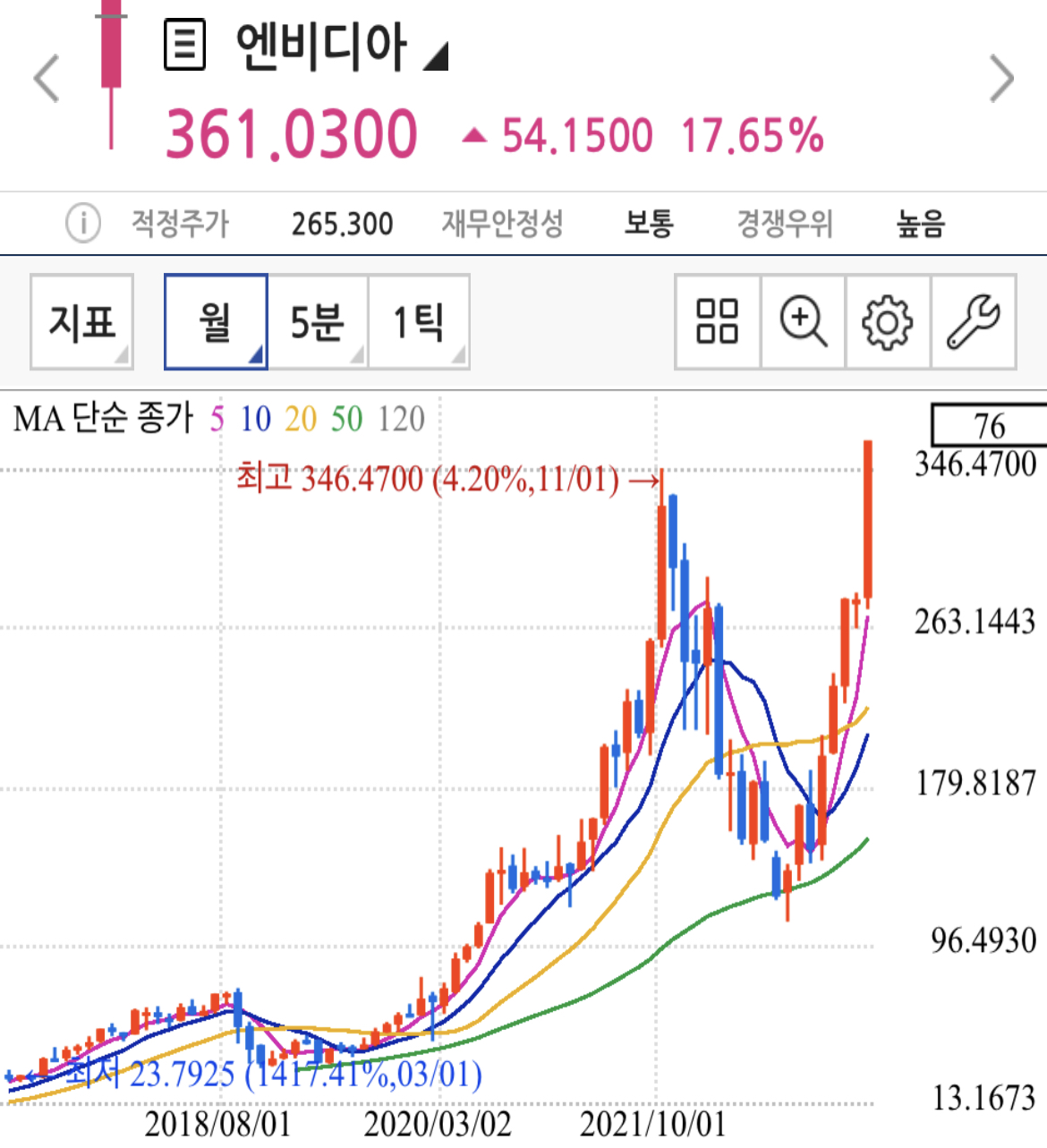 주봉과 월봉 차트로 보면 고점 72,450원을 찍은 후 긴 기간조정과 가격조정을 거치고 있는 종목으로 매물 소화과정은 대부분 거쳤고 엔비디아와 AI테마가 계속 화두가 된다면 유사한 테마들의 대장주로 유력한 종목 중 하나입니다.