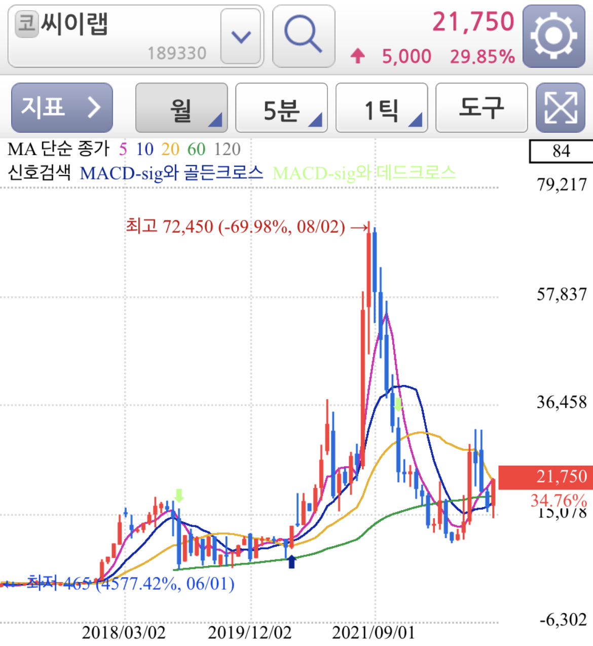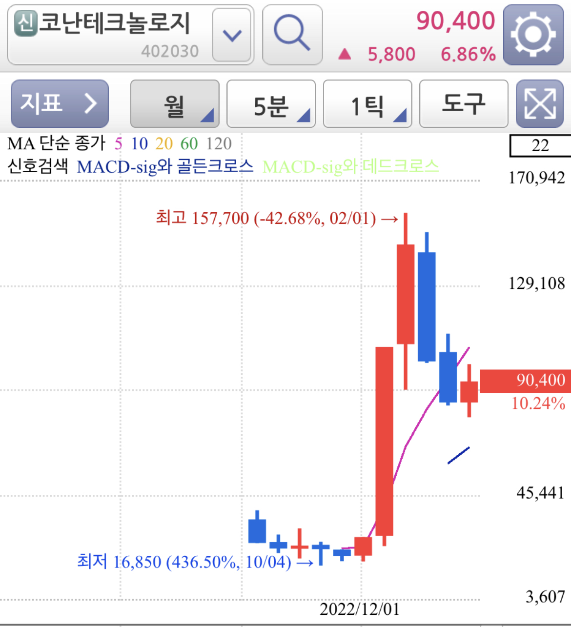일봉 차트로 보면 120선을 지지선으로 지지하고 추세 전환까지는 아니더라도 기술적 반등 또는 추세 전환을 위한 소폭 움직임 정도로 보여집니다.
