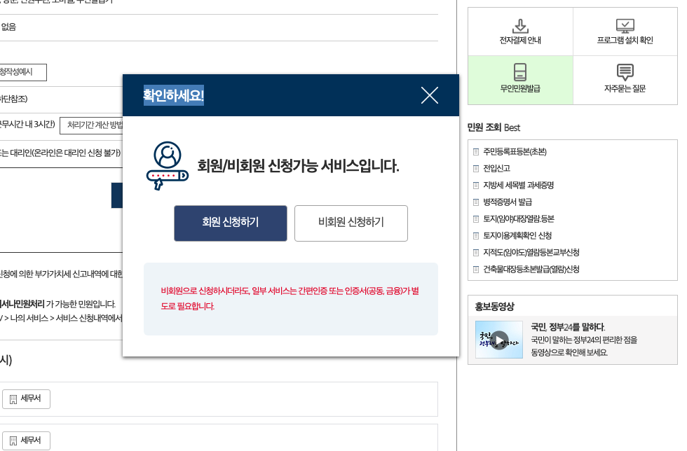 오늘은 회원가입을 하지 않고 비회원으로 발급하고 프린트까지 하는 방법에 대해서 설명하기 때문에 아래 화면에서 "비회원 신청하기" 버튼을 클릭해주면 됩니다.