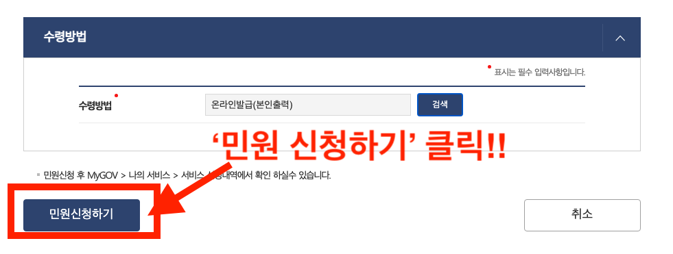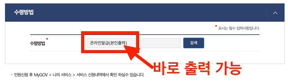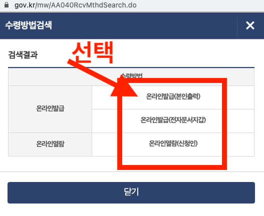 저는 출력하고 사진으로 찍을거라 온라인발급(본인출력)을 선택했지만, 온라인발급(전자문서지갑), 온라인열람(신청인) 등 3가지 중에서 선택할 수 있습니다.