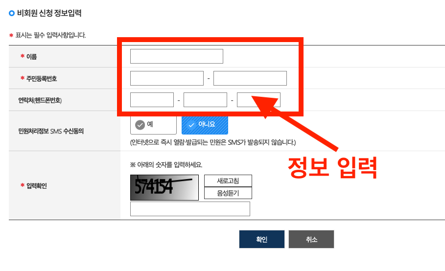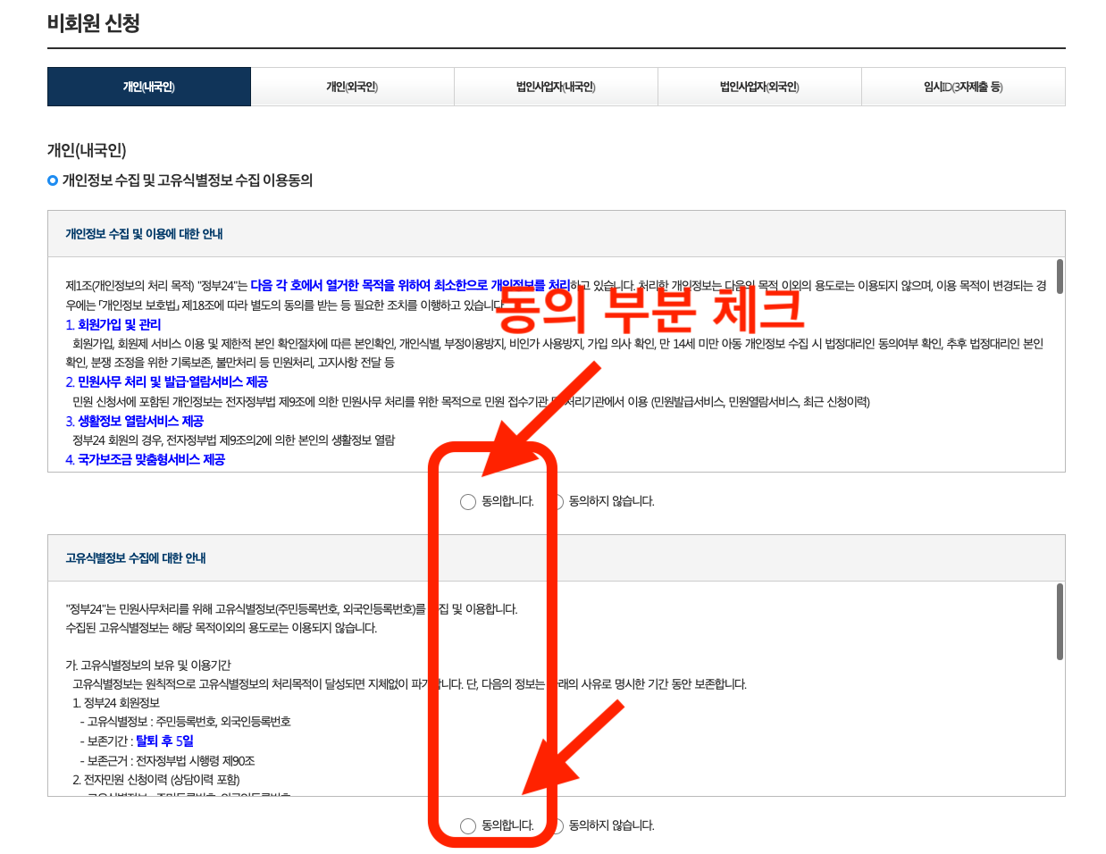 비회원 신청 화면에서 아래와 같이 '동의' 부분을 체크해줍니다.