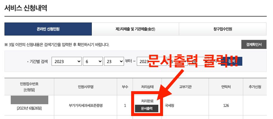 서비스 신청내역 화면에서 "문서출력"을 클릭해주면 부가가치세과세표준증명서 발급 프린트가 됩니다.