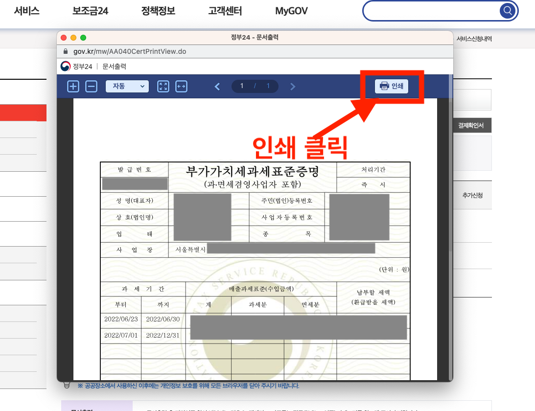 우측 상단에 있는 "인쇄" 버튼을 클릭하면 부가세과세표준증명원 서류가 인쇄됩니다.