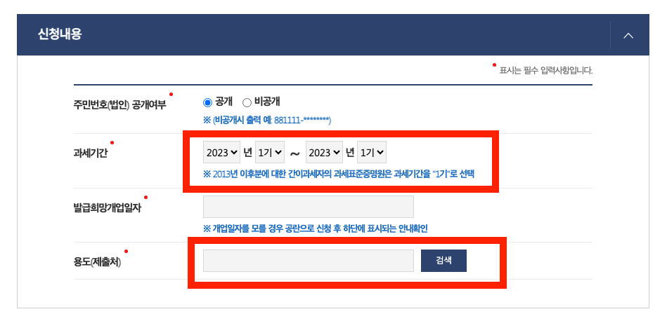발급받고자 하는 과세 기간을 선택해주고, 발급희망개업자(사업자 등록증에 있는 개업일자)를 적어주고 용도를 선택해주면 됩니다.