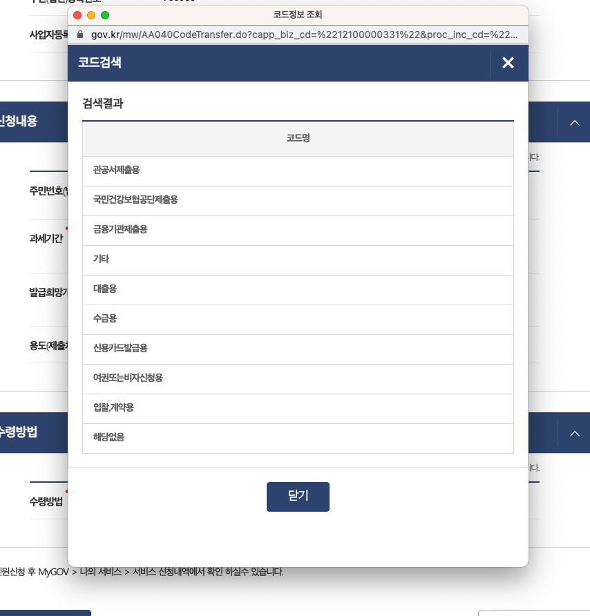 용도(제출처)는 검색을 클릭하면 아래와 같이 항목별로 뜨면 선택해주면 됩니다.