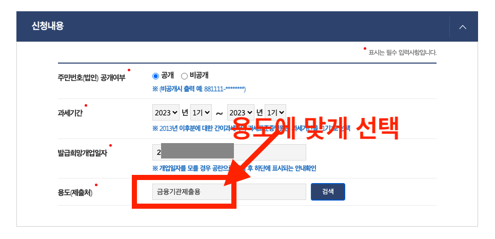 제출용 선택 필드는 관공서제출용, 국민건강보험공단, 금융기관, 기타, 대출용, 수금용, 신용카드발급용, 여권또는비자신청용, 입찰계약용, 해당없음 등이 있습니다.