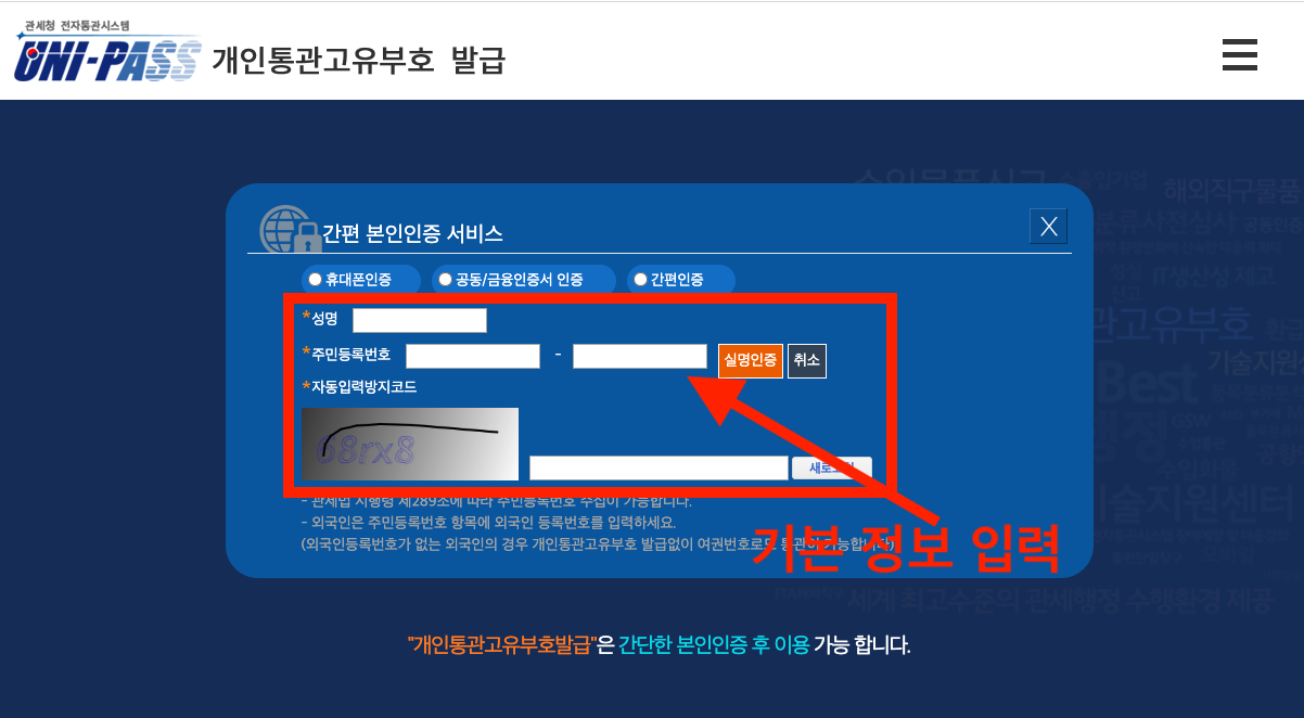 #개인통관고유번호 조회를 위해서 성명, 주민등록번호, 자동입력방지코드를 입력해줍니다.