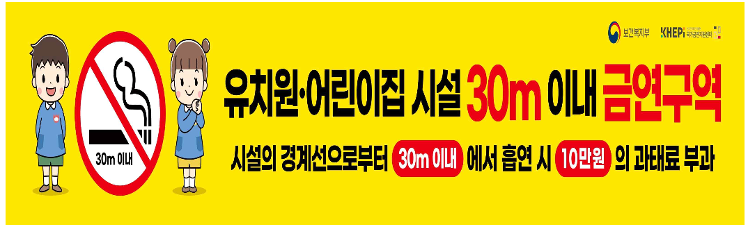 그동안「국민건강증진법」개정(2023.8.16.)을 통해 어린이집·유치원 주변의 금연구역 확대(시설 경계 10m→30m 이내) 및 「초ᆞ중등교육법」에 따른 학교 주변 금연구역 신설(시설 경계 30m 이내)이 결정된 바 있으며, 1년 간 시행 유예를 거쳐 2024년 8월 17일(토)부터 본격 시행된다.