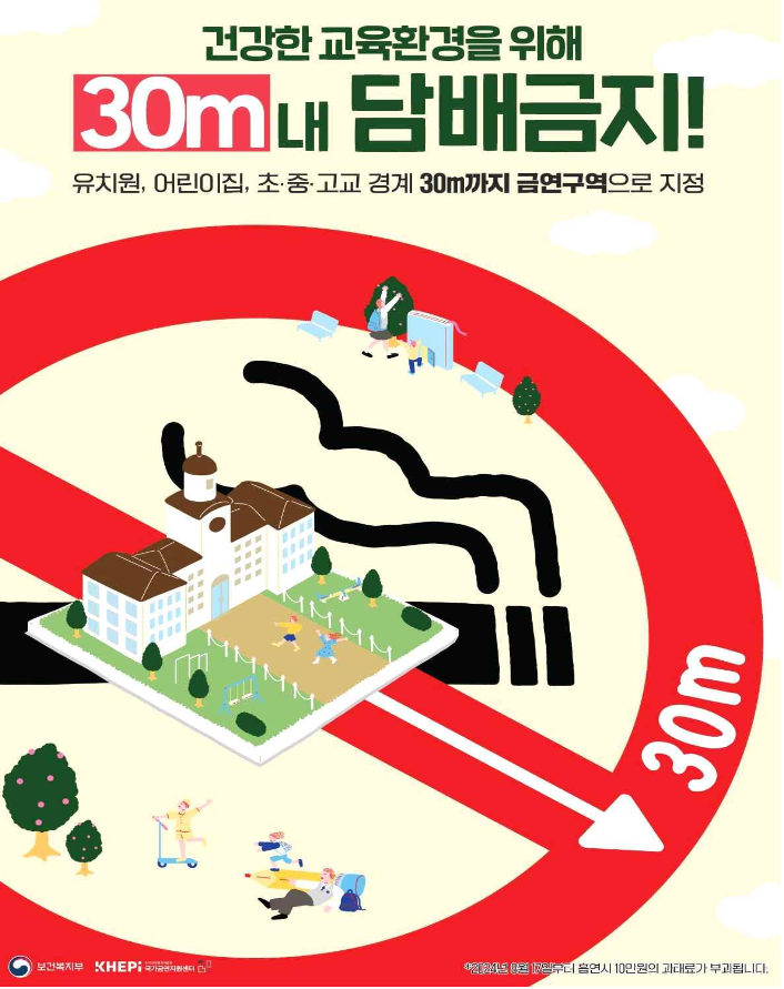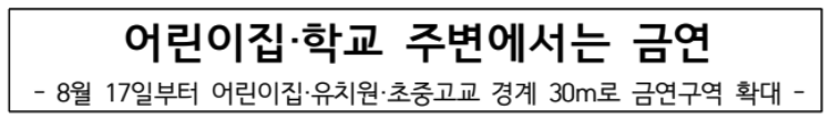 그동안「국민건강증진법」개정(2023.8.16.)을 통해 어린이집·유치원 주변의 금연구역 확대(시설 경계 10m→30m 이내) 및 「초ᆞ중등교육법」에 따른 학교 주변 금연구역 신설(시설 경계 30m 이내)이 결정된 바 있으며, 1년 간 시행 유예를 거쳐 2024년 8월 17일(토)부터 본격 시행된다.