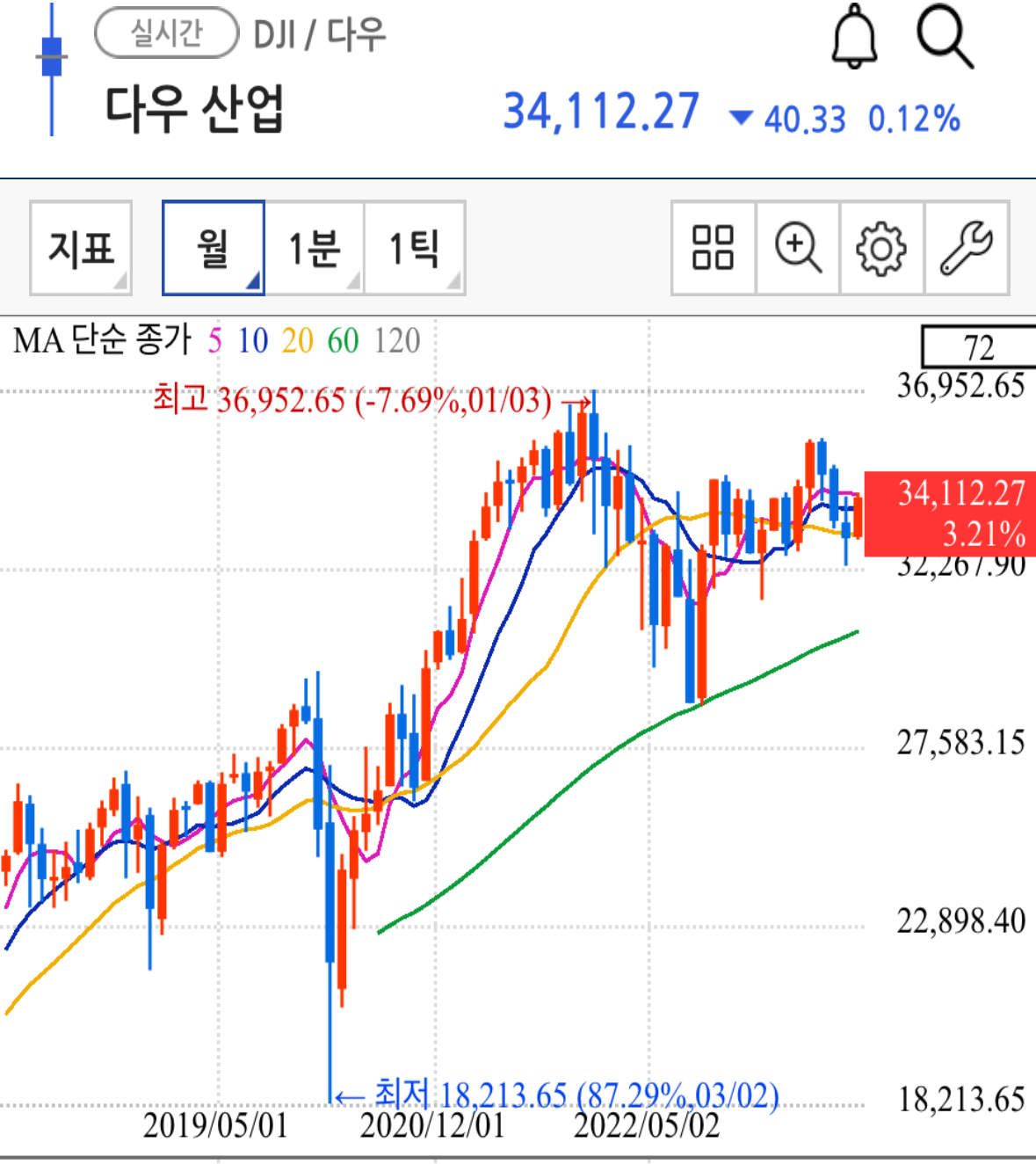 하지만 다우지수의 주봉과 월봉 차트를 보면