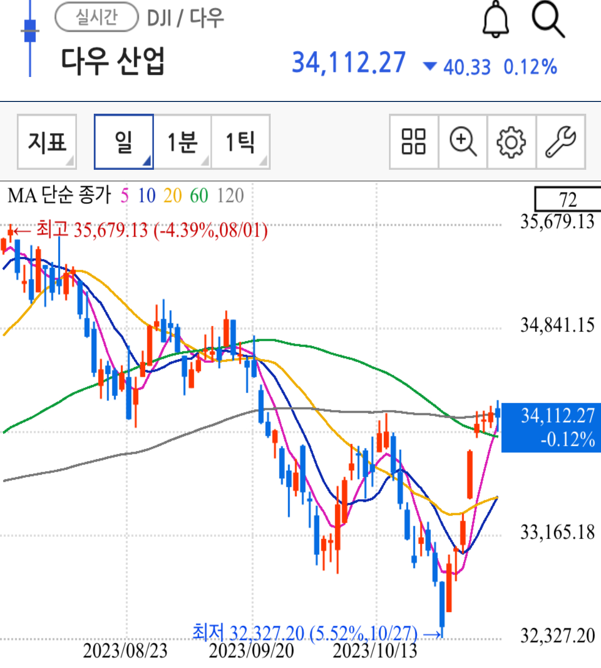 다우지수 일봉과 주봉 월봉 차트입니다. 일봉상으로만 보면 단기 하락 추세가 여전히 강하고 기술적 반등 수준으로 밖에 보이지 않습니다.