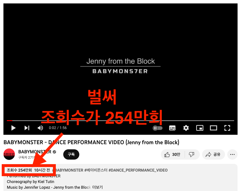 전일 밤에 BabyMonster 댄스 퍼포먼스 비디오가 나왔는데 벌써 이 시간 조회가 254만회를 넘어서고 있습니다.
