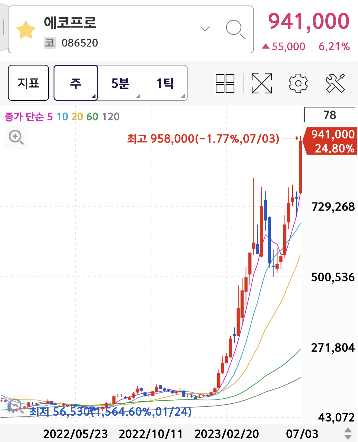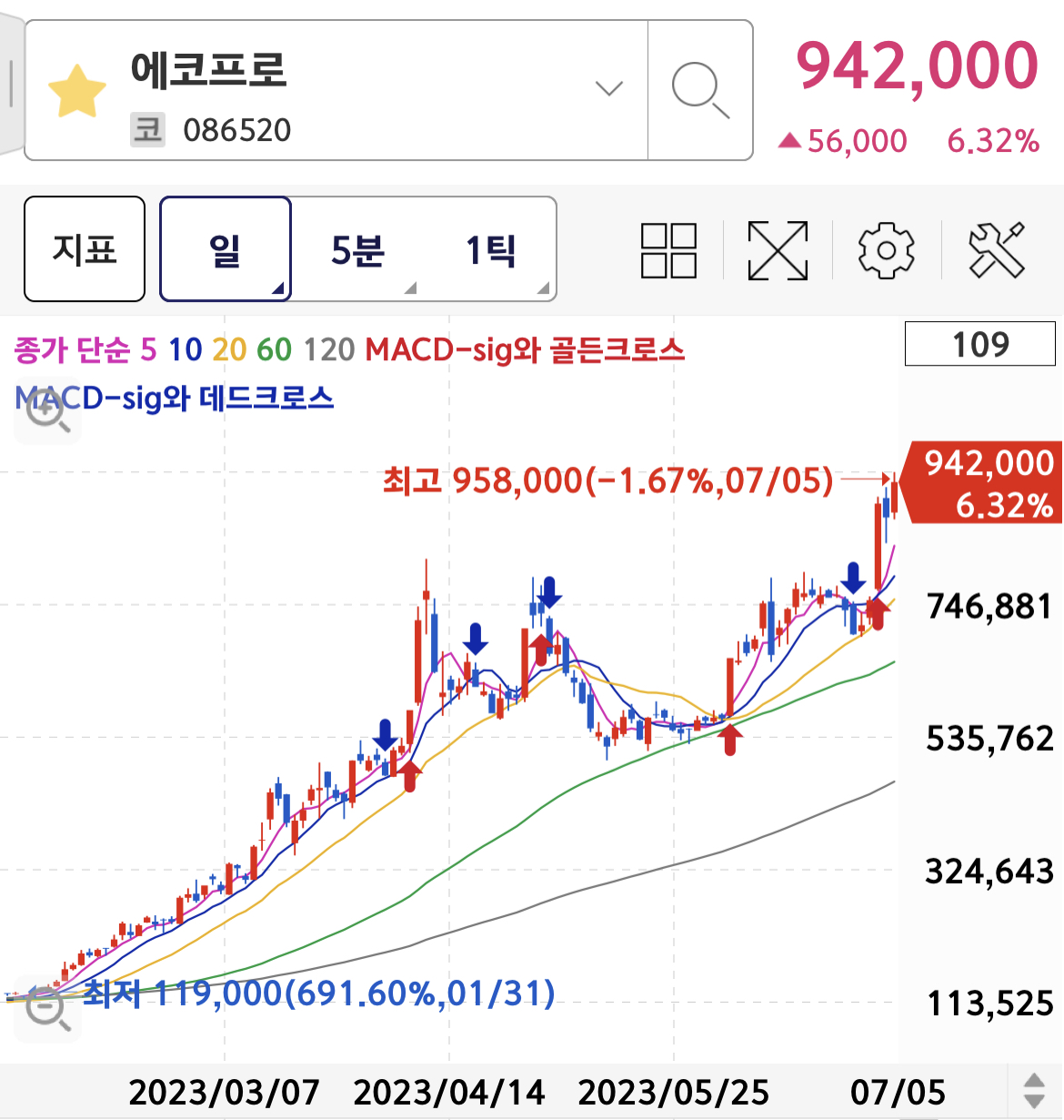 7/3(월) 하반기 첫 시작하는 날 테슬라의 판매량 증가 소식에 2차전지주가 모두 상승하면서 에코프로는 조정 후 다시 20%대 급등세를 보여주었습니다.