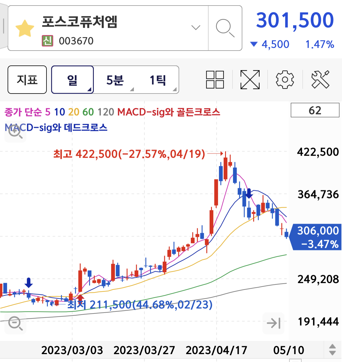 포스코홀딩스에 비해서 상승폭이 많았던 양극소재와 음극제 소재주인 포스콩퓨처엠의 주가는 -1.47% 하락 마감되었습니다.