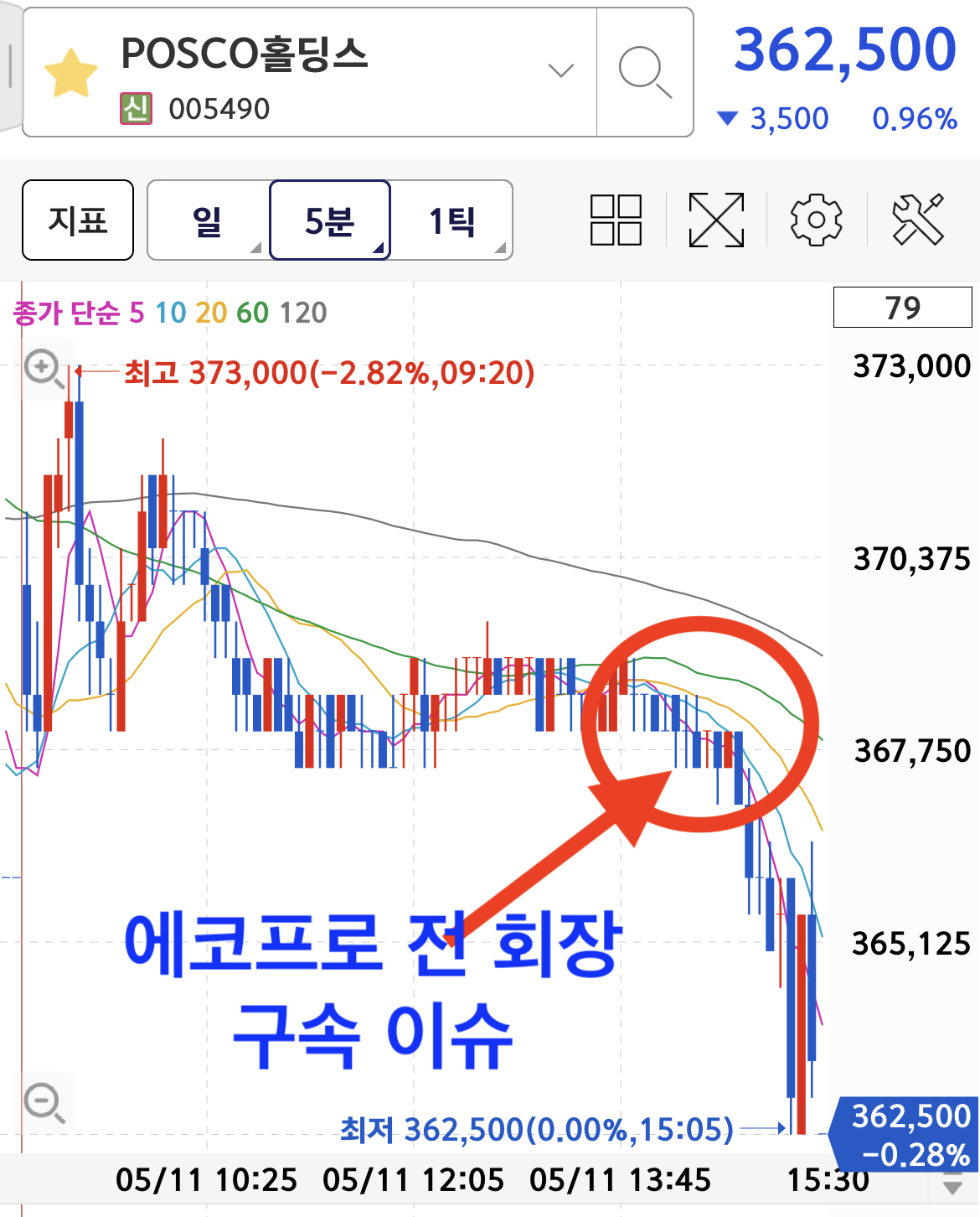 오늘 에코프로 전회장의 법정 구속 이슈에 따른 주가 흐름을 살펴보겠습니다.