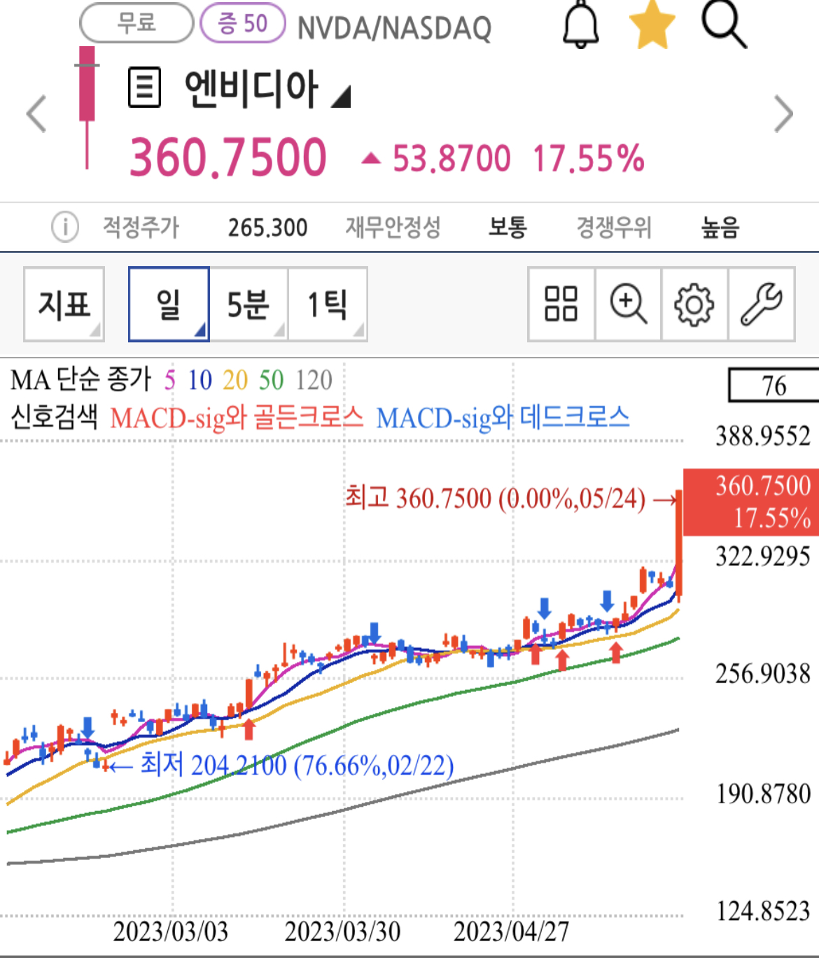 엔비디아는 실적 발표를 앞두고 매물 소화 과정을 거치면서 관망세가 우세했는데 실적이 예상보다 더 좋은 어닝서프라이즈를 보여주면서 주가도 그에 화답하면서 장 마감후 급등했습니다.