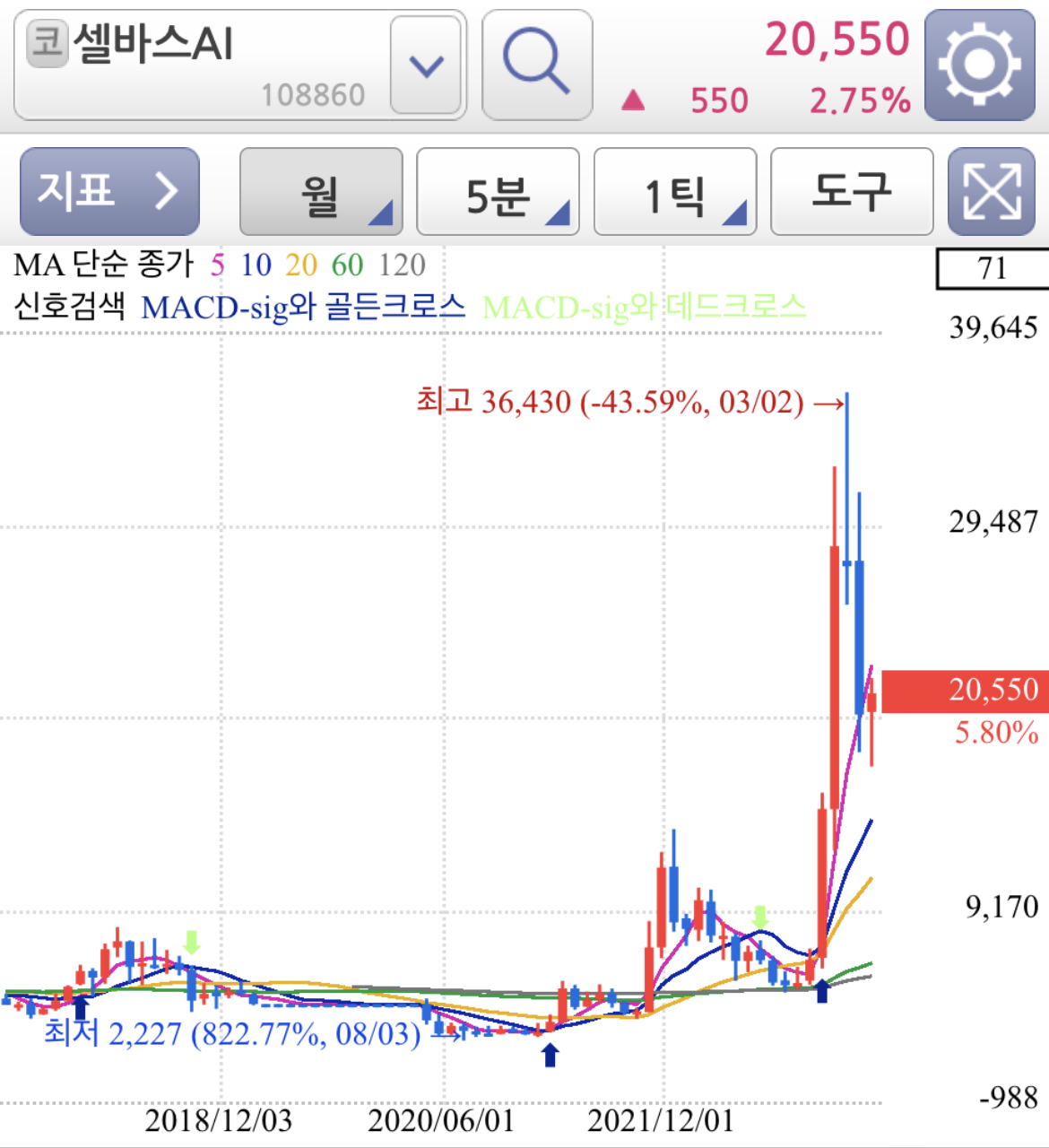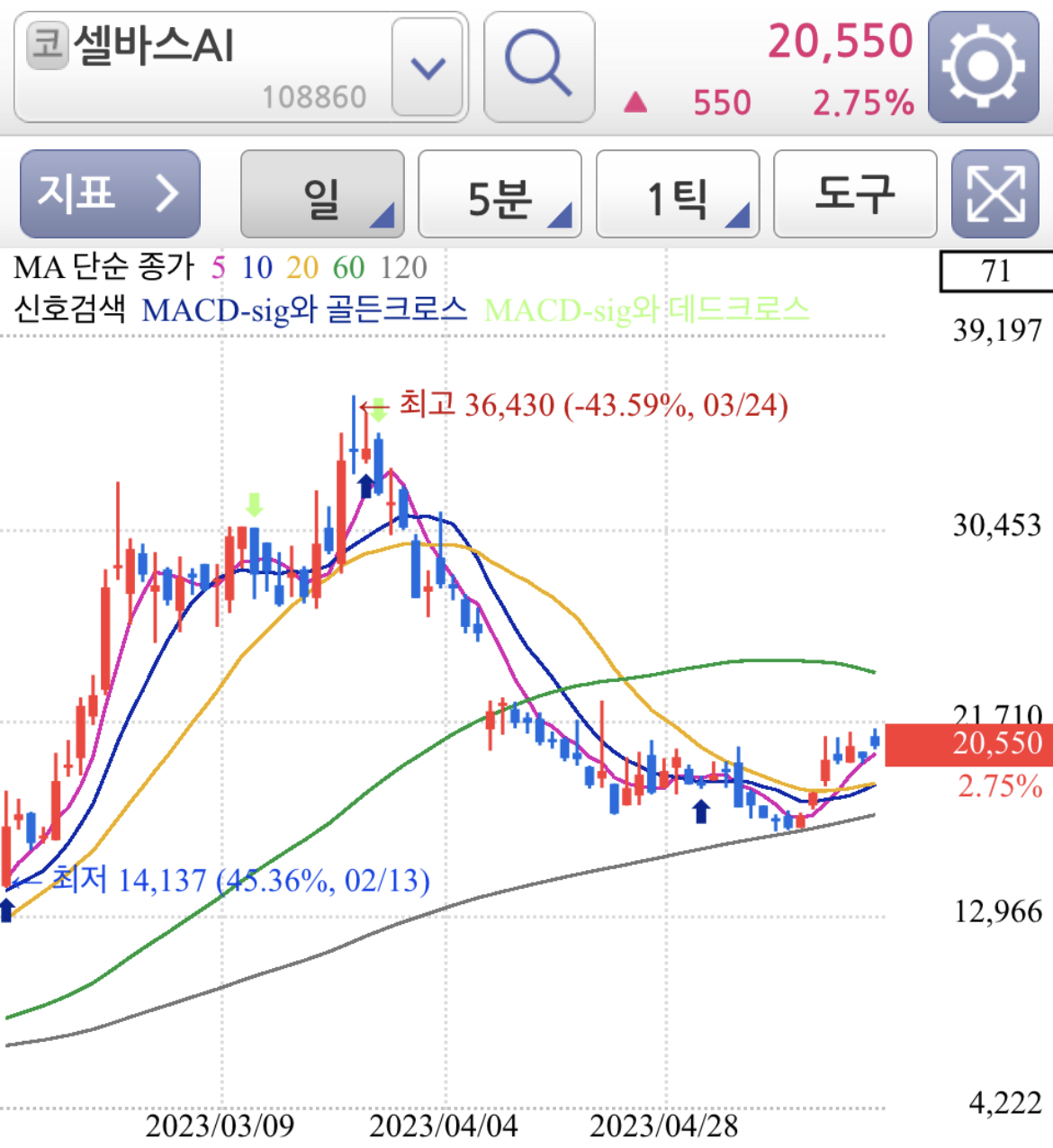 위 셀바스AI 종목과 같이 120선 밑으로 하락하지 않고 지지하면서 주가가 움직이는 모습입니다. 즉 종목 개별 장세보다는 테마주내에 묶여서 주가는 유사한 흐름을 이어간다고 볼 수 있습니다.