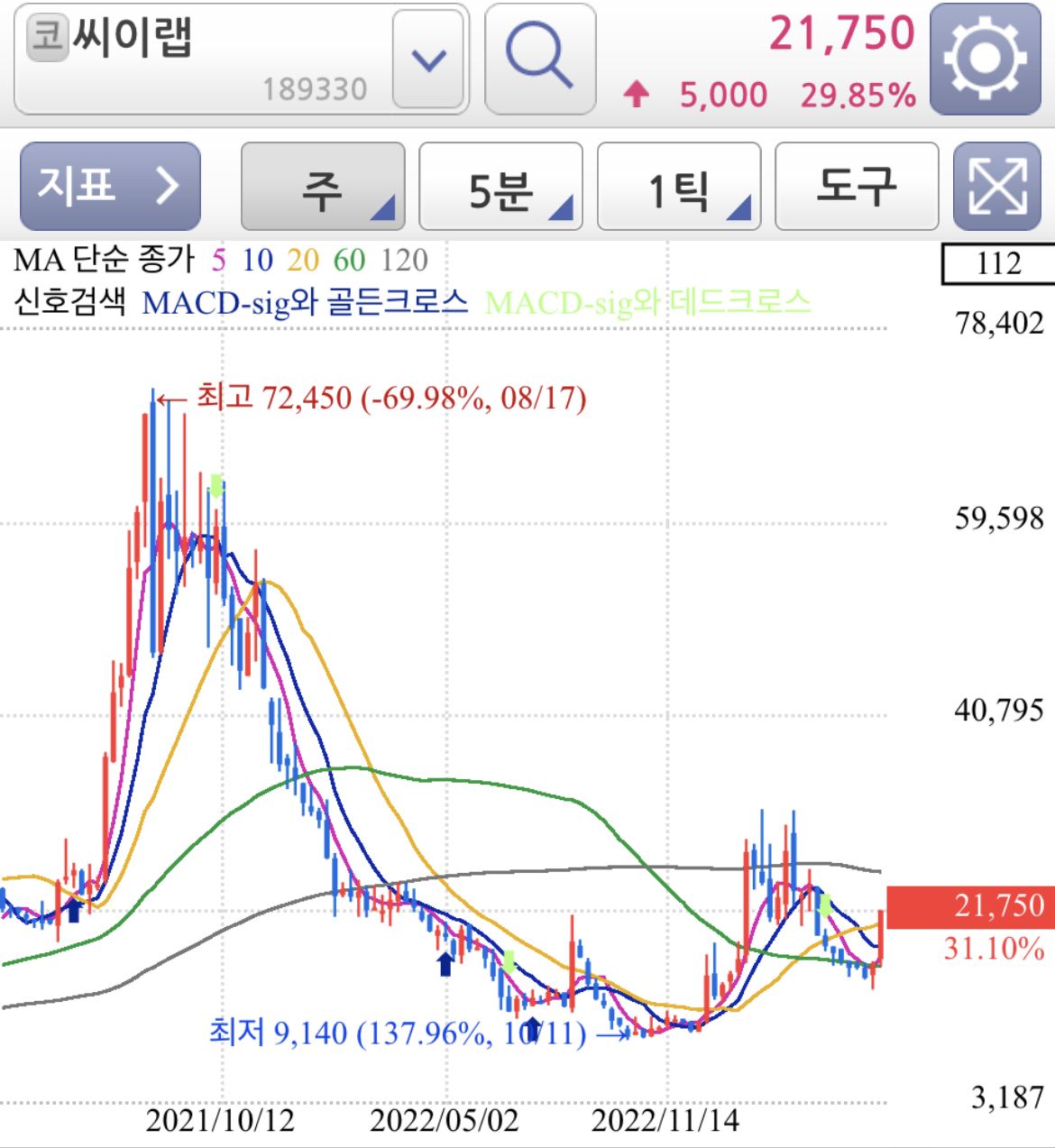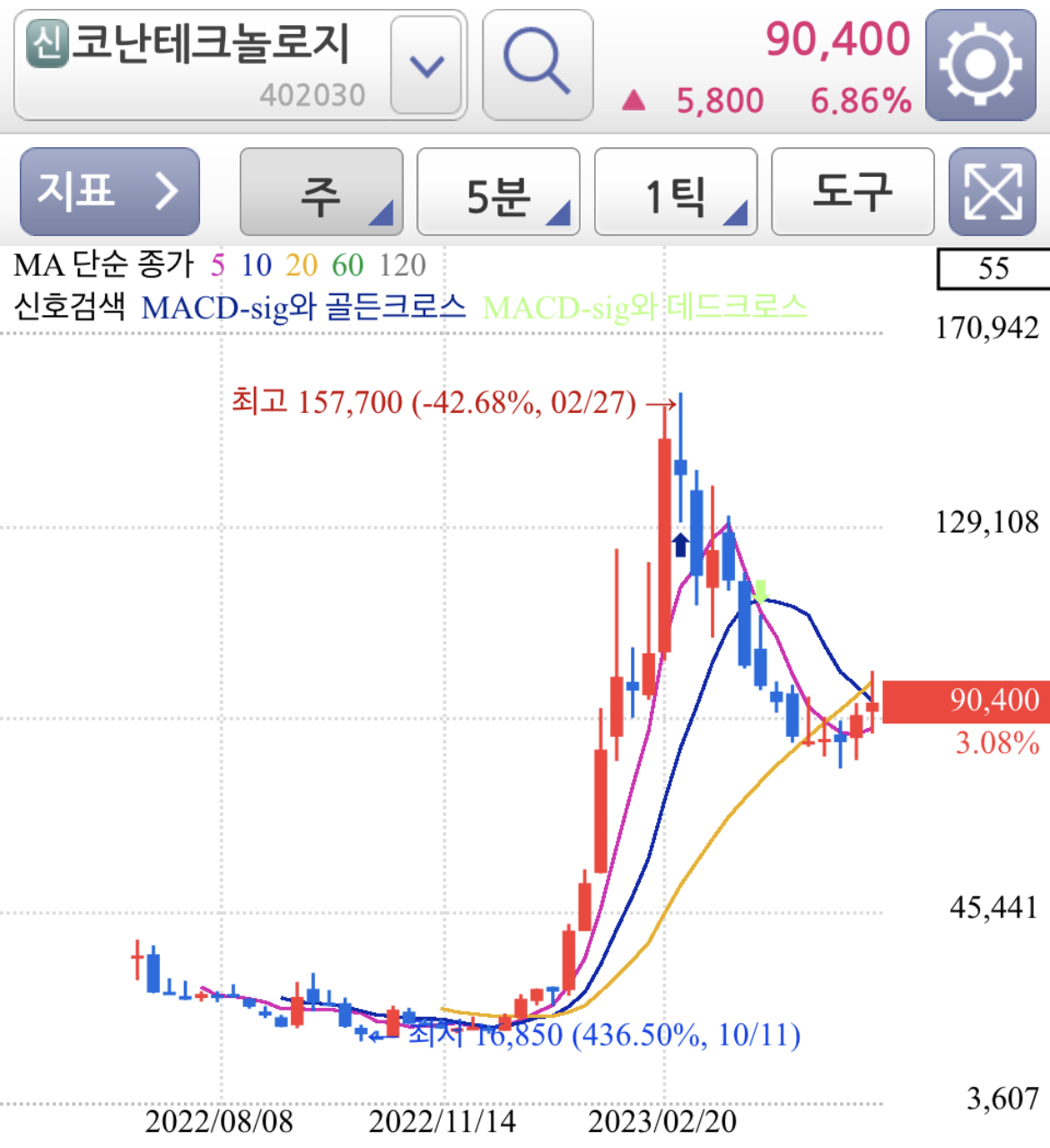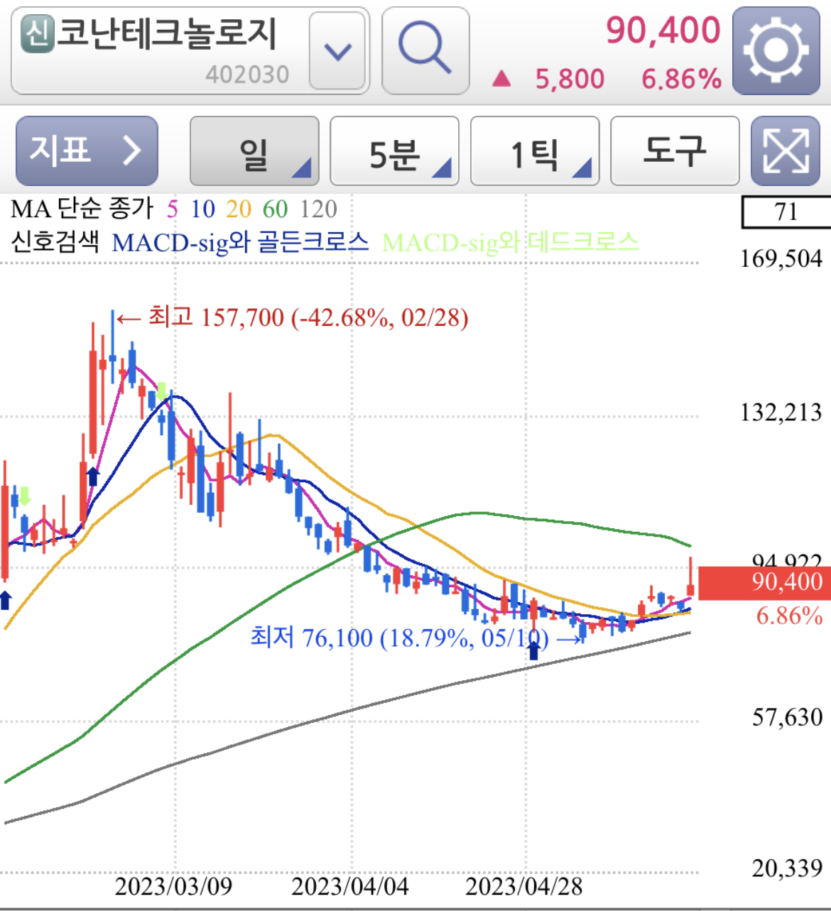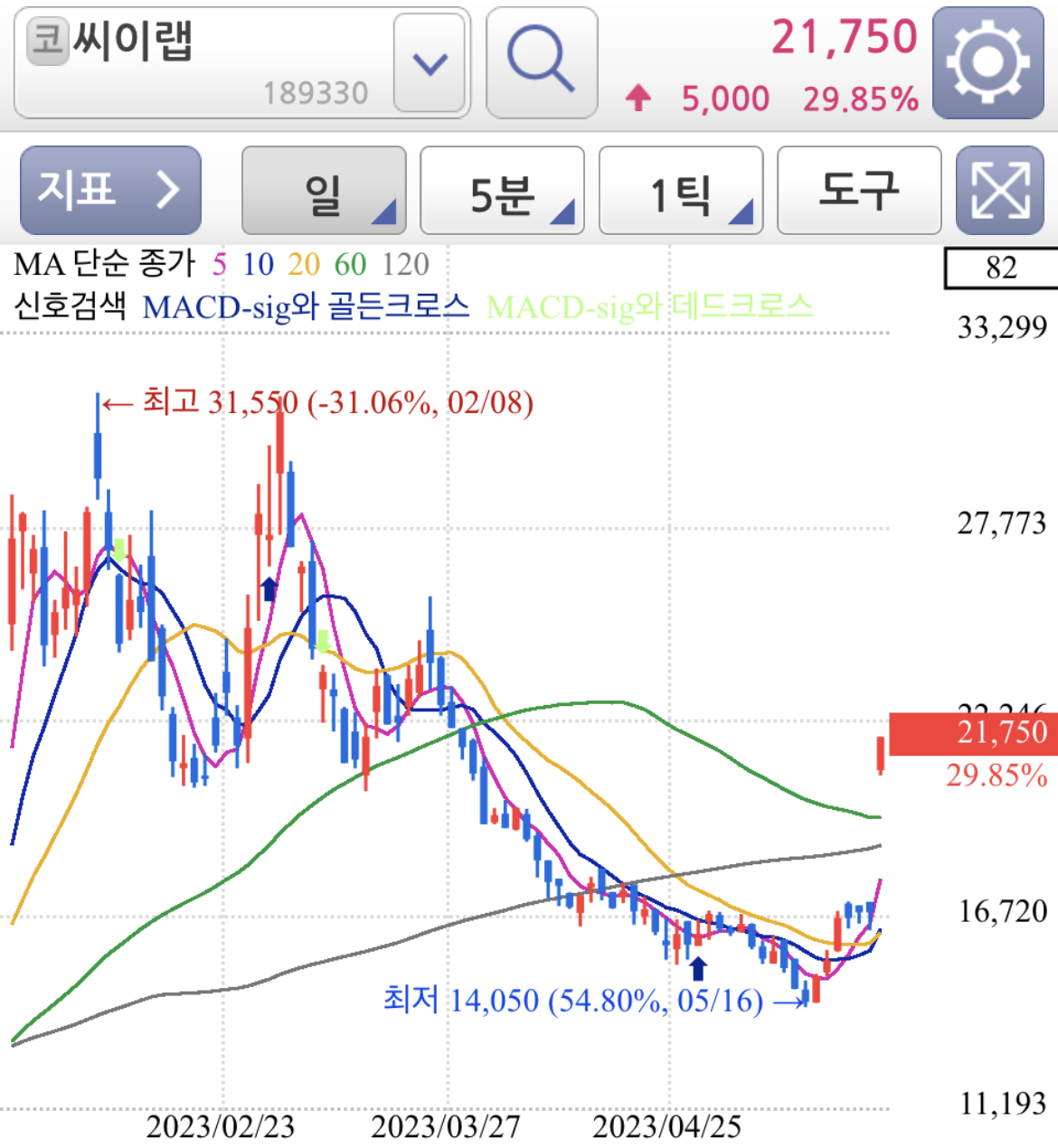 일봉 차트로 보면 120선을 지지선으로 지지하고 추세 전환까지는 아니더라도 기술적 반등 또는 추세 전환을 위한 소폭 움직임 정도로 보여집니다.