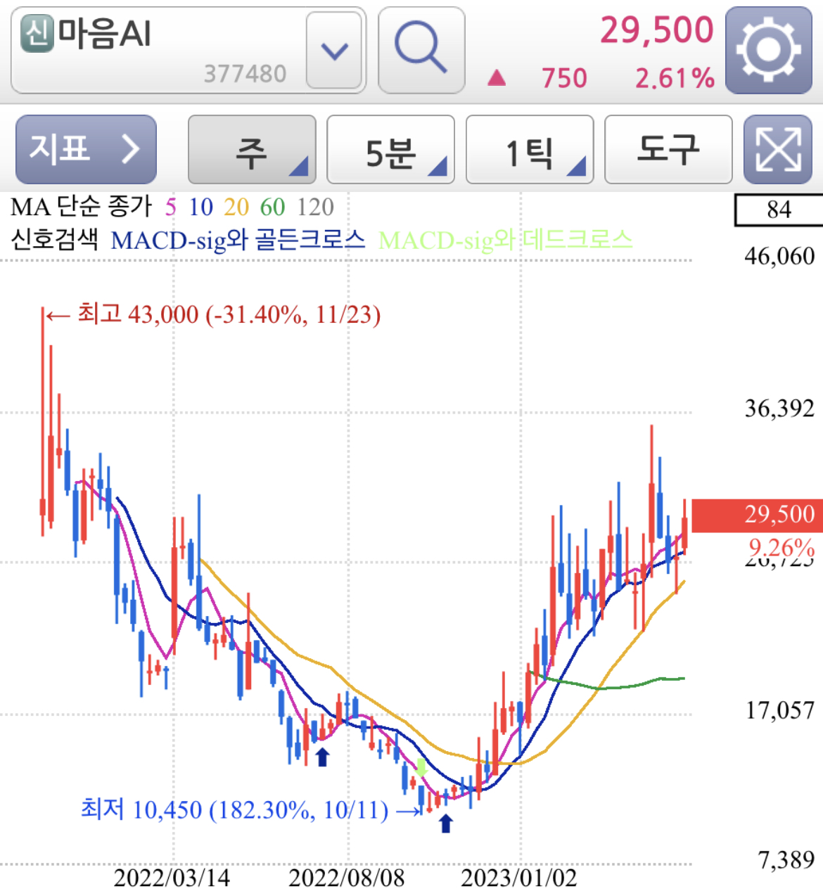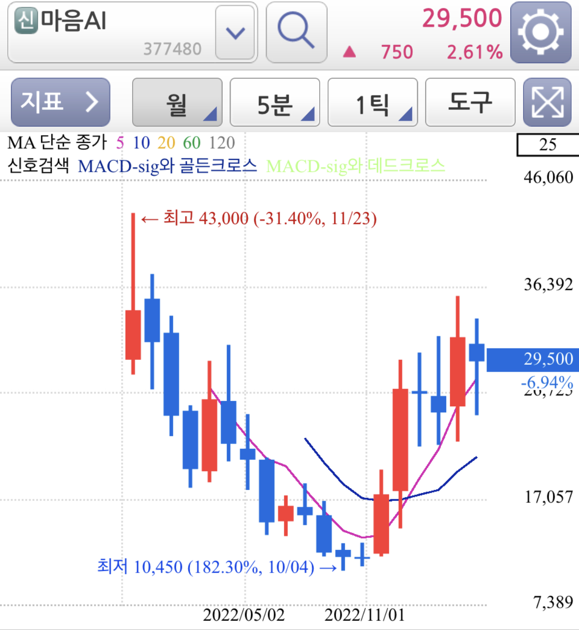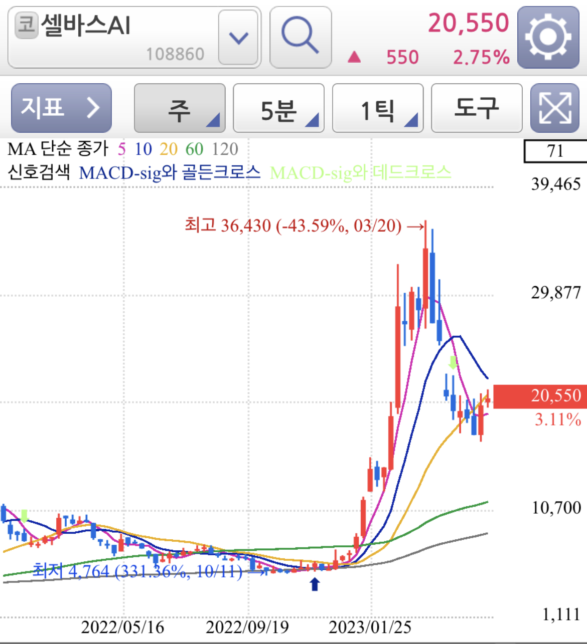 주봉과 월봉 차트로 보면 고점 72,450원을 찍은 후 긴 기간조정과 가격조정을 거치고 있는 종목으로 매물 소화과정은 대부분 거쳤고 엔비디아와 AI테마가 계속 화두가 된다면 유사한 테마들의 대장주로 유력한 종목 중 하나입니다.