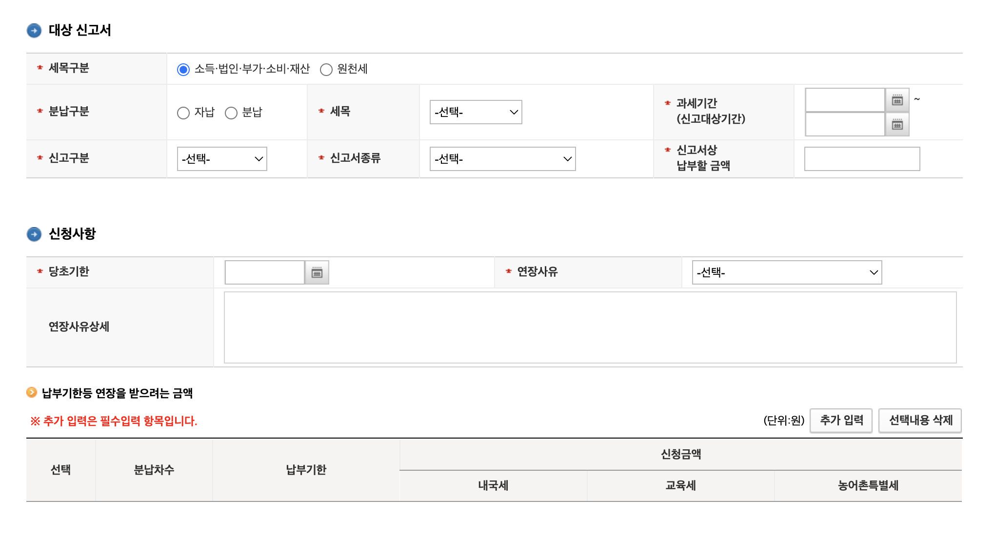 아래와 같이 작은 소메뉴인 "신고분 납부기한 연장신청' 메뉴를 클릭해줍니다.