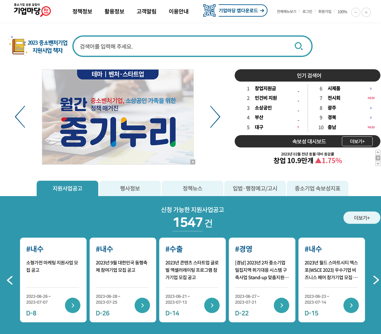 중소기업과 중견기업들에 대한 각종 지원 업무를 전담하는 곳으로 창업, 벤처기업, 중소기업, 소상공인, 자영업자 등을 분야별 정책정보와 지원사업을 하고 있는 곳이다.