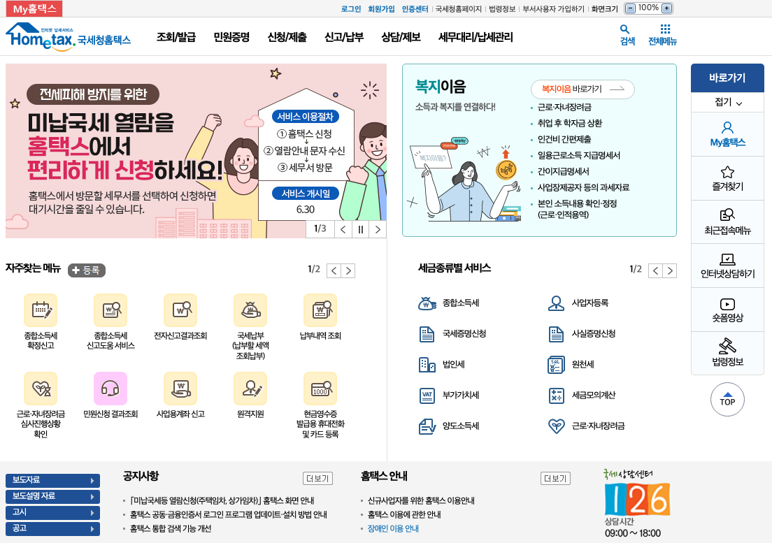 각종 부가세신고, 종합소득세신고, 전자세금계산서 발행, 사업자용 카드등록, 사업자용 통장 등록, 각종 서류 제출 인쇄 등 사업자에 관한 세무관련 정보를 확인하고 납부할 수 있는 사이트
