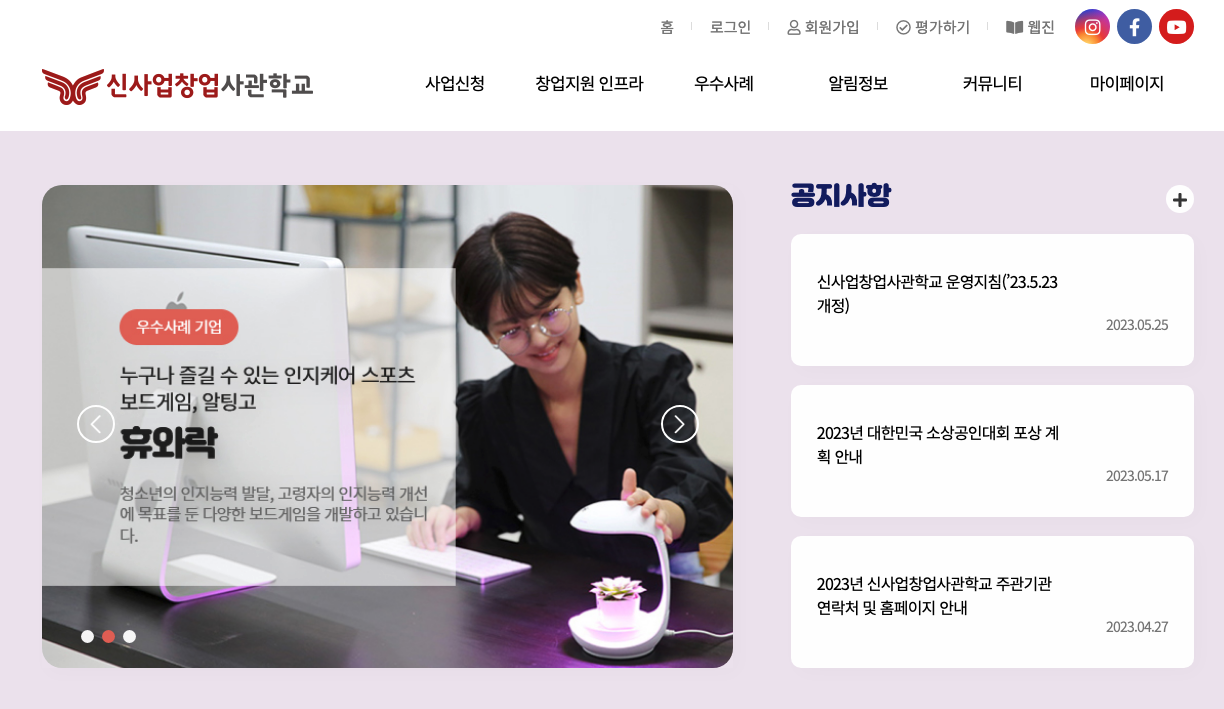 신사업 아이디어로 창업하려는 예비 창업자를 선발하여 이론교육, 점포경영체험교육, 창업멘토링을 패키지로 지원해주는 사이트