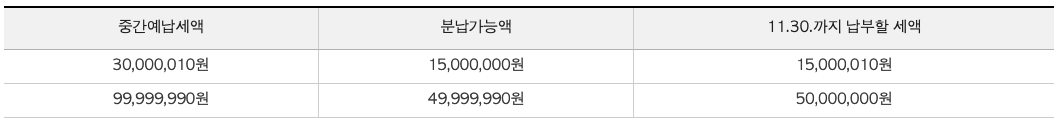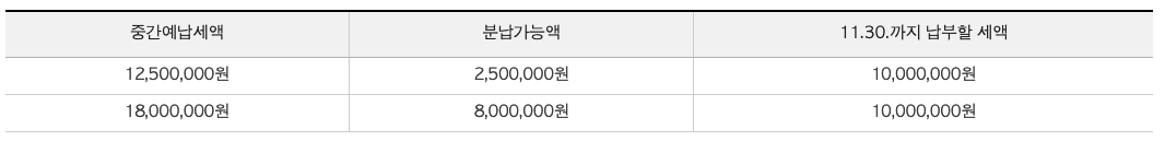 1. 중간예납세액이 1천만원 이하인 경우 : 분납 대상 아님(11.30.까지 전액 납부)