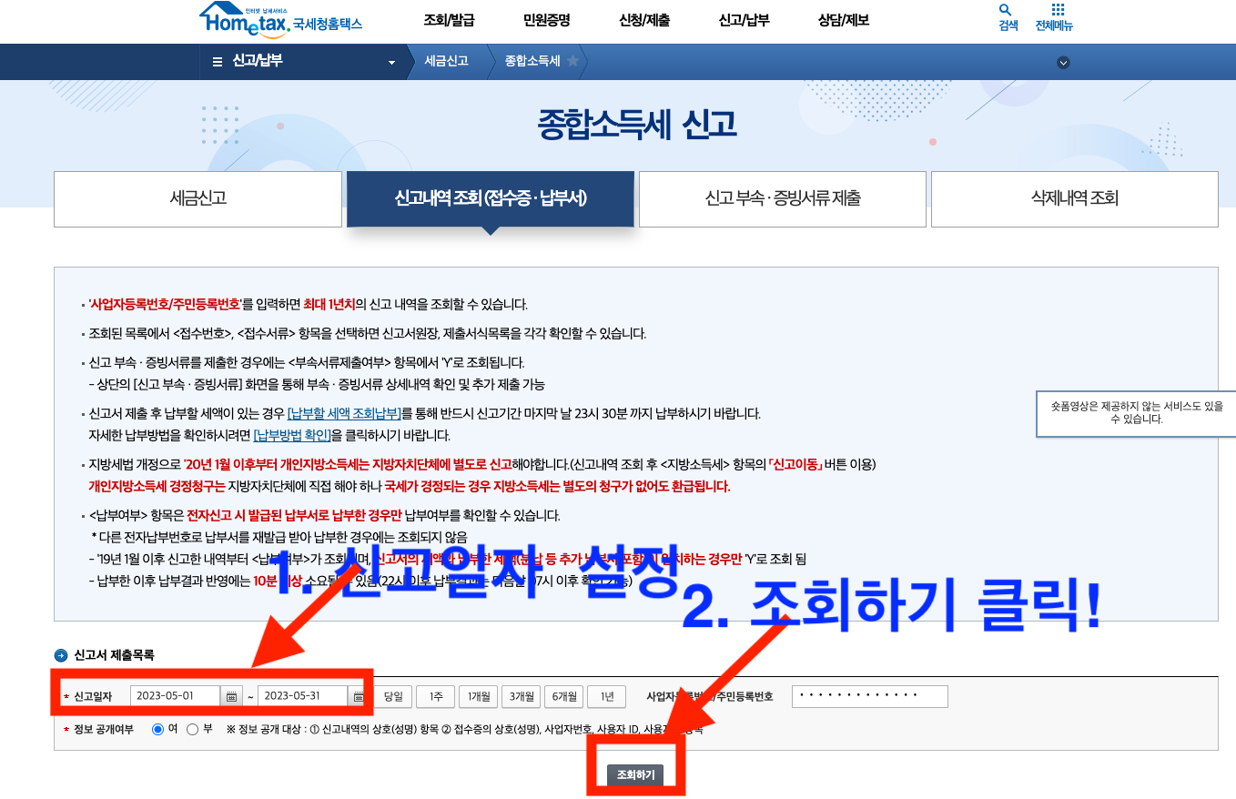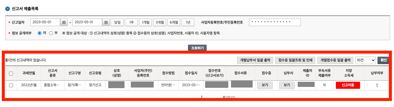 하단부에 있는 "조회하기' 버튼을 클릭하면 #종합소득세신고내역조회 확인이 됩니다.