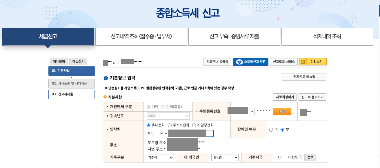 종합소득세 국세청 홈택스 신고를 위해 기본적인 이름, 주민등록번호 등은 명기되어 있고 연락처에 전화번호를 입력해줍니다.