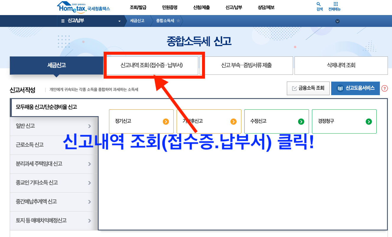 아래와 같이 신고내역조회(접수증·납부서) 클릭합니다.