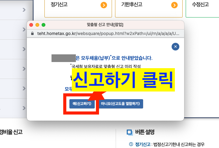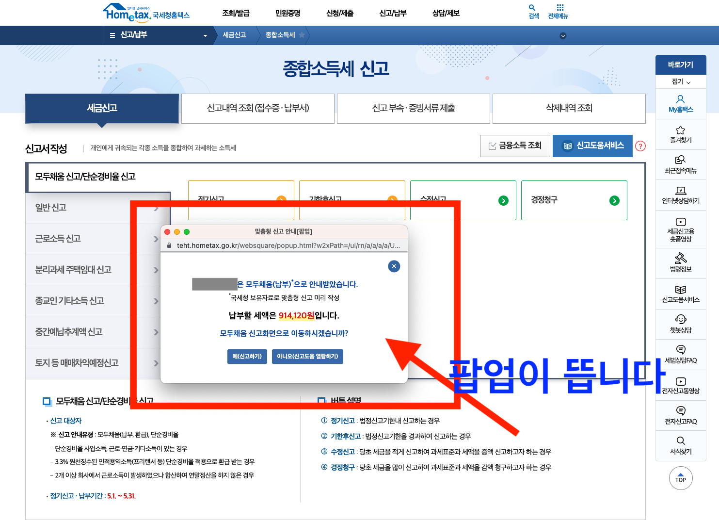 기본적으로 로그인을 하면 아래와 같이 모두채움(납부)으로 안내받았고 국세청 보유자료로 맞춤형 신고 미리 작성이라고 팝업이 뜹니다.