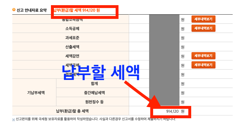 만약, 이 납부할(환급)할 세액이 아래와 같이 914,120원으로 뜨지 않고 금액 숫자 앞에 "-"가 있다면 환급받는 금액이됩니다.