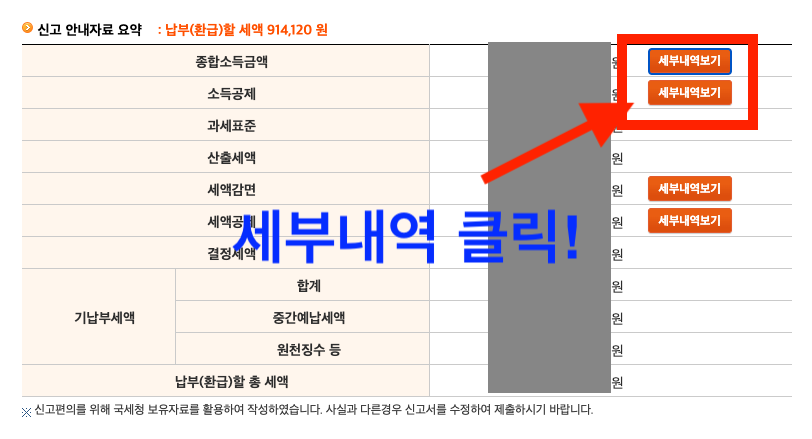 종합소득금액, 소득공제, 세액감면, 세액공제 등 세부 내역을 확인하려고 하면 '세부내역보기'를 클릭해줍니다.