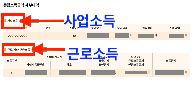 종합소득액 세부내역은 아래와 같이 사업소득에 대한 주업종코드, 수입금액, 필요경비, 소득금액과 함께 근로소득, 기타 연금소득에 대한 공제등과 소득금액을 한 눈에 볼 수 있습니다.