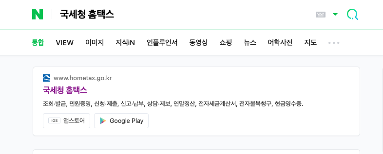 네이버, 다음, 구글 포털에서 '국세청 홈택스'라고 검색하면 국세청 홈택스 사이트가 접속이 됩니다.